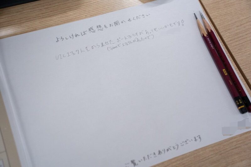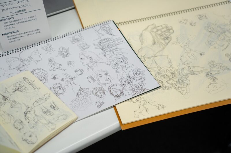 それ以外の見せ方は人それぞれ。モニターに表示されているポートフォリオを紙に印刷してファイルにまとめたり、デッサンが描かれたクロッキーを展示したり、名刺を置いたりといった工夫が行われていました。