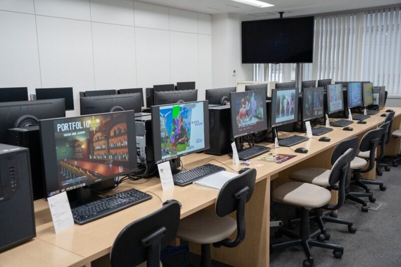今回のスカウト展には卒業年次の学生の約半分が参加。各学生のポートフォリオは、教室のパソコンのモニターに表示されています。