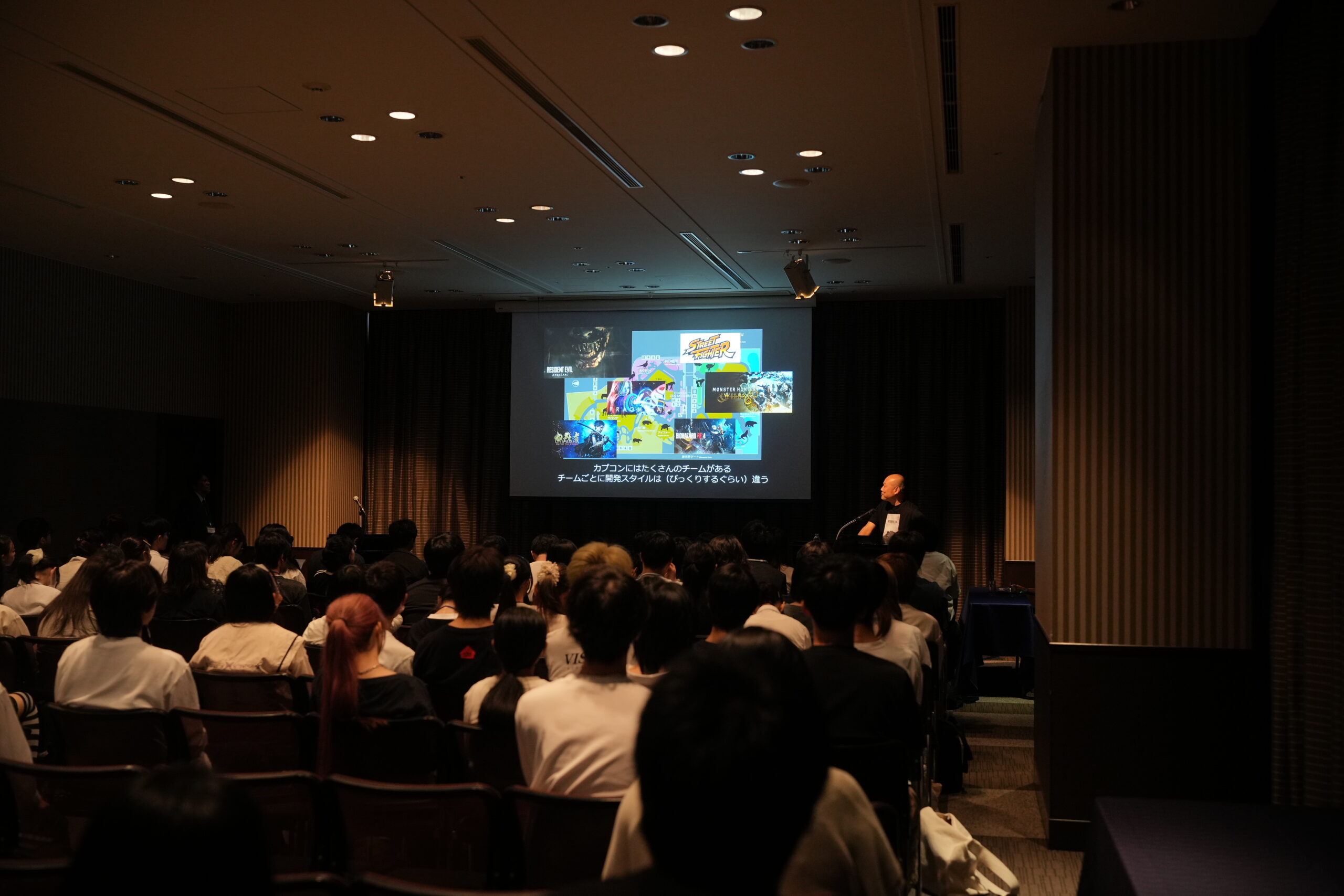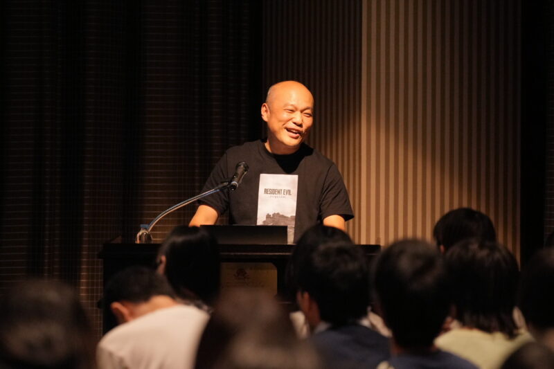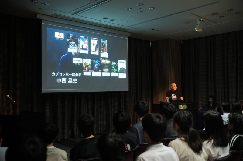 暑い夏の日、外の気温と同じぐらいの熱量の講演会が開催されました。講師は、株式会社カプコン第一開発部の中西晃史(なかにし こうし)さん。中西さんは世界的ヒットゲーム 『バイオハザード』シリーズのディレクターをされておられる、ゲームに携わる人なら憧れの人。席に座る在校生も前のめりになって、話に耳を傾けます。