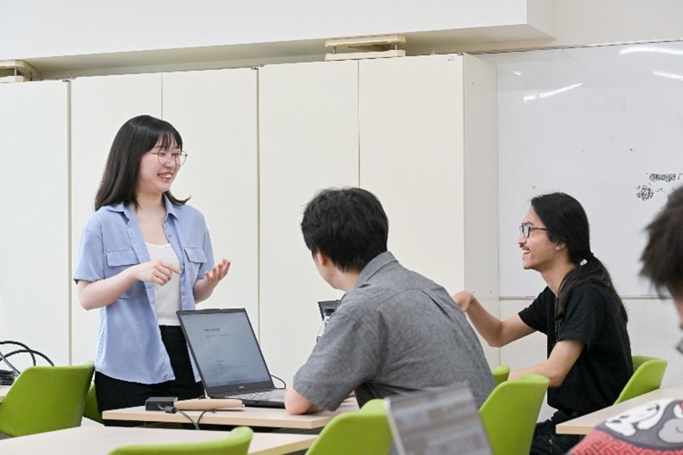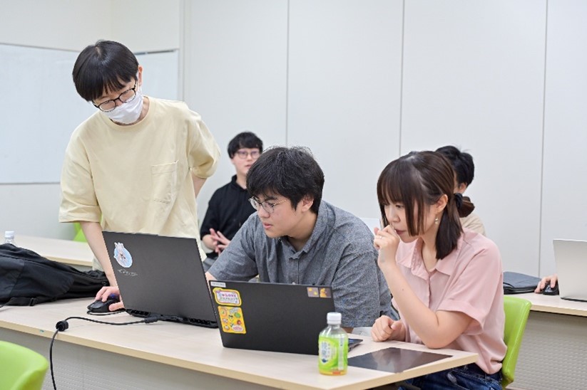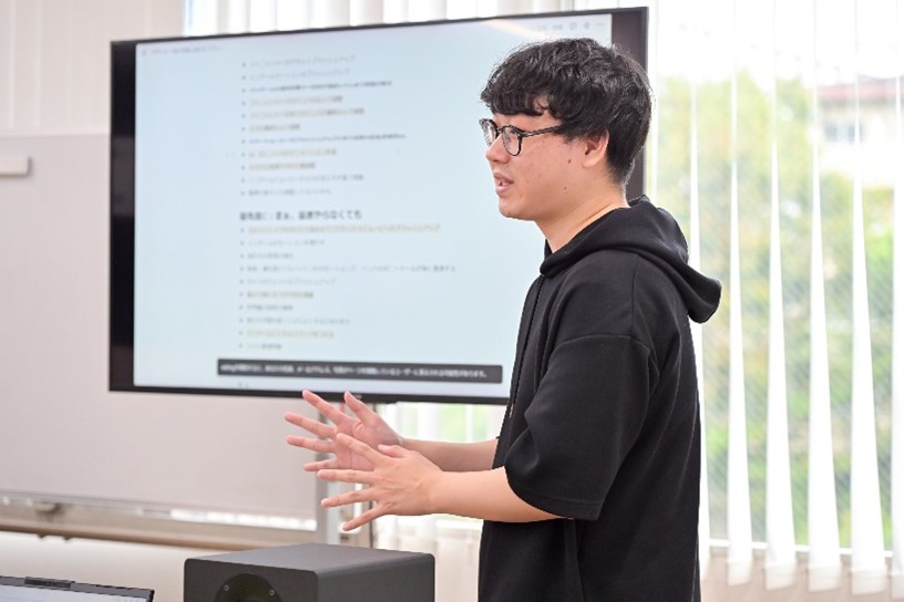週に1度の定例会を重ね、制作・ブラッシュアップ・中間レビューを経て、この日ついに集大成を披露します。教室で待機するメンバーたちは、最後の動作確認や資料の投影準備に追われています。