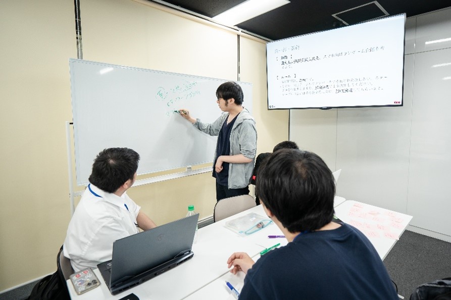 各メンバーが25分で企画を考え、テーブルごとに発表して代表案を選び、2分以内でプレゼンを実施しました。